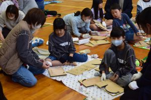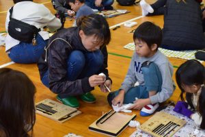 親子ふれあい活動では、木製のコリントゲーム作りに取り組みました。ナチュラルバックヤードの皆様にご指導いただきながら、保護者の方と子どもたちが楽しそうに話しながら活動する様子は、とてもほほえましかったです。完成後は、自分の作品だけでなく、友だちの作品で遊ぶ子どもたちの姿も見られ、体育館は笑顔と楽しむ声であふれていました。世界に一つだけのオリジナルコリントゲームができあがり、皆さんは大喜びでした。