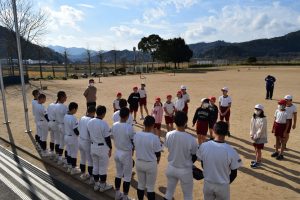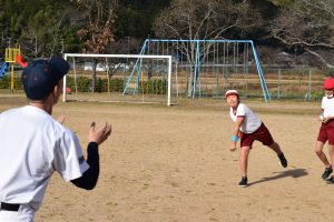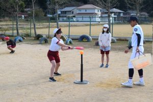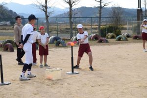 12月11日(木)の5時間目に、高校生による出前授業がありました。野球部の高校生が講師となり、Tボールを通して「打つ・投げる・捕る」といった基本的な動きを、分かりやすく丁寧に教えてくださいました。