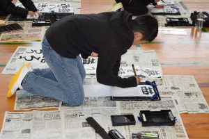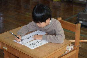 1・2年生は書き初めペンを使い、3年生以上は毛筆で、それぞれ学年の課題に取り組みました。冬休み中の練習の成果を発揮しようと、どの子も集中して書く姿が印象的でした。