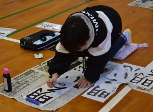 体育館には静かな緊張感が広がり、子どもたちは一文字一文字に心を込めて、真剣な表情で筆を運んでいました。