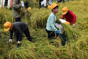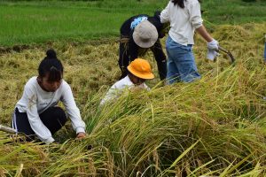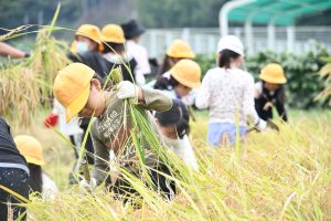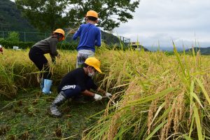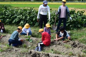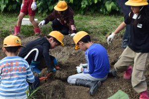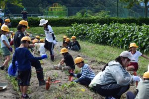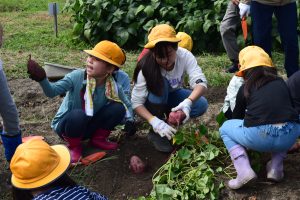 当日はさわやかな秋晴れの、サツマイモ掘り日和。児童たちは、春に植えた苗が大きなイモに育っているのを見て、とても驚いていました。高学年が低・中学年に掘り方のコツを教えながら、みんなで楽しく作業しました。1人で掘るのは大変ですが、友だちが手伝ってくれると上手に掘れることを実感。この活動を通して、改めて協力することの大切さを学ぶことができました。