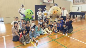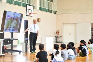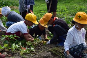 10月2日、全校でサツマイモ掘りを行いました。畑の周りの草が伸びていたため、5・6年生が事前にマルチはがしや草刈りをして、みんなが掘りやすいように準備してくれました。